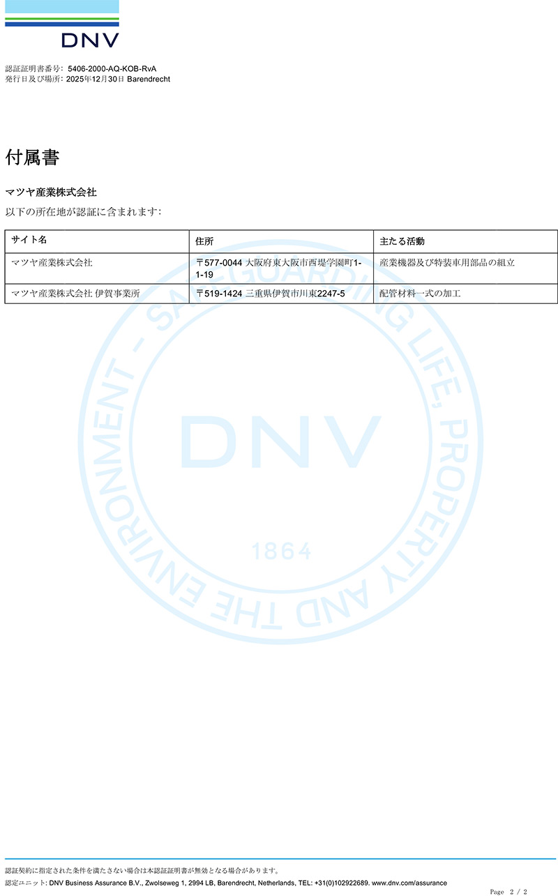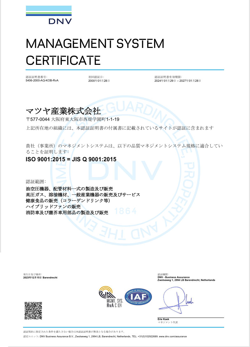 マツヤ産業は、品質管理及び品質保証のための国際標準モデル ISO9001を取得し、